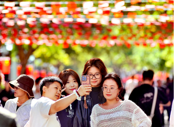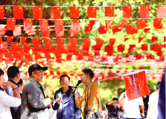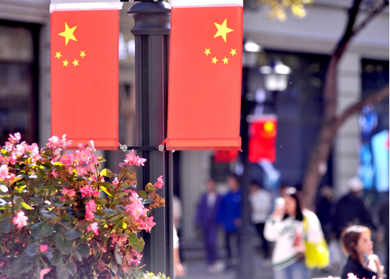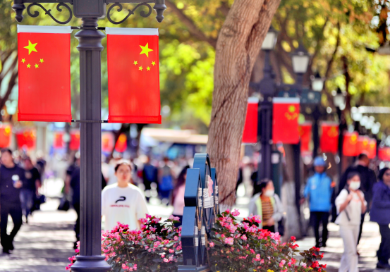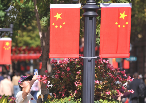 9月22日,哈尔滨市道里区中央大街上挂起了许多五星红旗,游客们纷纷驻足与国旗合影。