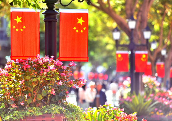 国旗飘扬,为这条百年老街增添了更多的喜庆气氛。