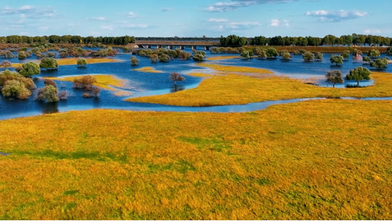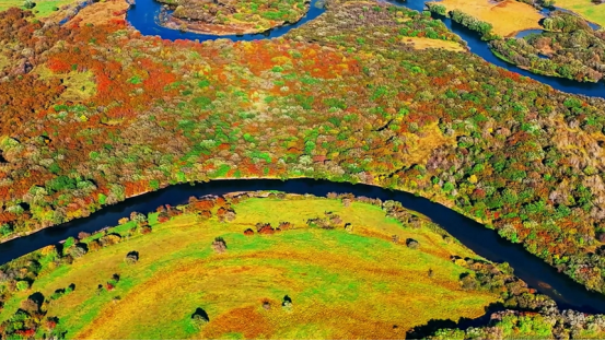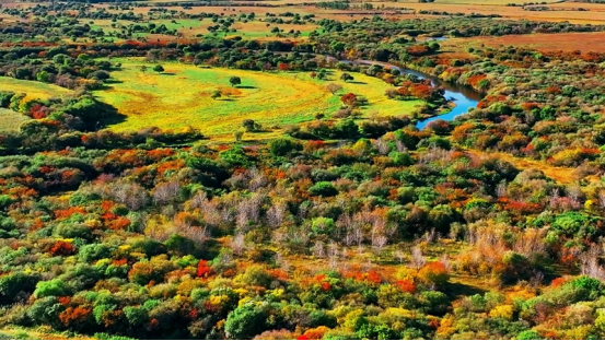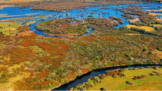秋意为墨,山川为卷。位于黑河市爱辉区坤河乡的坤河国家湿地公园,正悄然披上斑斓的秋装。林海如虹,层林尽染,宛若大自然倾翻了调色盘,一簇簇暖黄、一抹抹赤金、一片片墨绿,交织出秋日最浓郁的画卷。它们静默地倒映于水中,与天空遥相对望,美得磅礴而又沉静,共同勾勒出独特的“五花山”色自然景观带。(记者苏靖刚、关桐、胡鹏博)