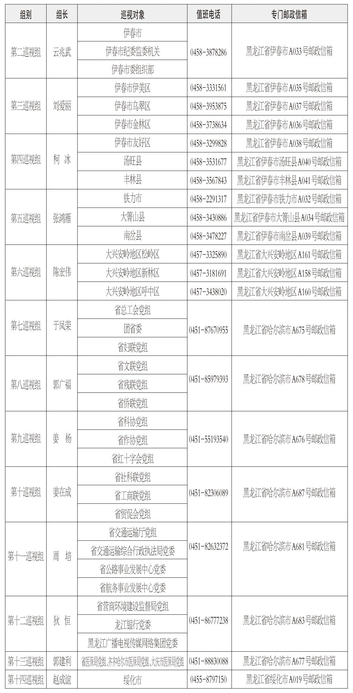 根据黑龙江省委关于巡视工作的统一部署,截至10月13日,十三届省委第八轮巡视完成进驻工作。省委巡视组将对伊春市及所辖的伊美区、乌翠区、友好区、金林区、铁力市、汤旺县、丰林县、南岔县、大箐山县,大兴安岭地区松岭区、新林区、呼中区,省交通运输厅、省营商环境局、省工商联、省总工会、团省委、省妇联、省文联、省作协、省科协、省侨联、省贸促会、省残联、省红十字会、省社科联、省公路事业发展中心、省航务事业发展中心、省交通运输综合行政执法局等30个地方、单位党组织开展常规巡视;对伊春市纪委监委机关、市委组织部开展提级巡视;对省医保局、齐齐哈尔市医保局、大庆市医保局党组开展医保支付政策落实机动巡视,对绥化市开展养老服务机动巡视;对龙江银行、黑龙江广播电视传媒网络集团党委开展巡视“回头看”。