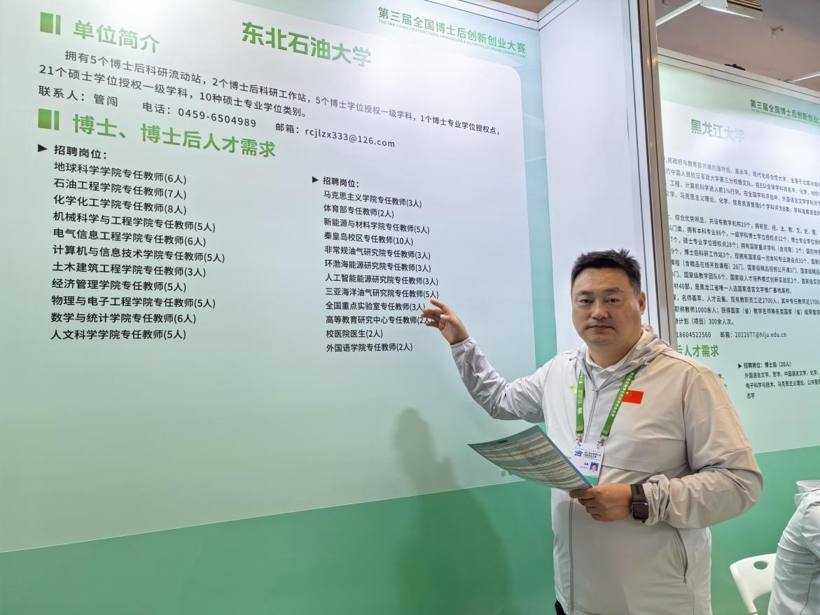 “这次引才效果还是不错的,仅一天半的时间,就接待了数十人咨询、接收简历近50份。接下来,我们将加速推进人才面试工作,推动人才意向快速转化为实际引才成果,切实为区域发展与学校建设注入新动能。”说到本次大赛期间的人才招聘活动,东北石油大学人事处处长王勇如是说。“东北石油大学积极响应国家和黑龙江省的号召,不仅有4支团队参赛,更带来了50余个教学科研岗位。我们充分整合了《新时代龙江人才振兴60条》、大庆市‘校企政’联合体政策以及学校自身的人才待遇,形成了强大的‘政策红利叠加’效应,诚意引才。希望能够借助这个国家级平台,为龙江振兴和学校发展汇聚更多英才。”