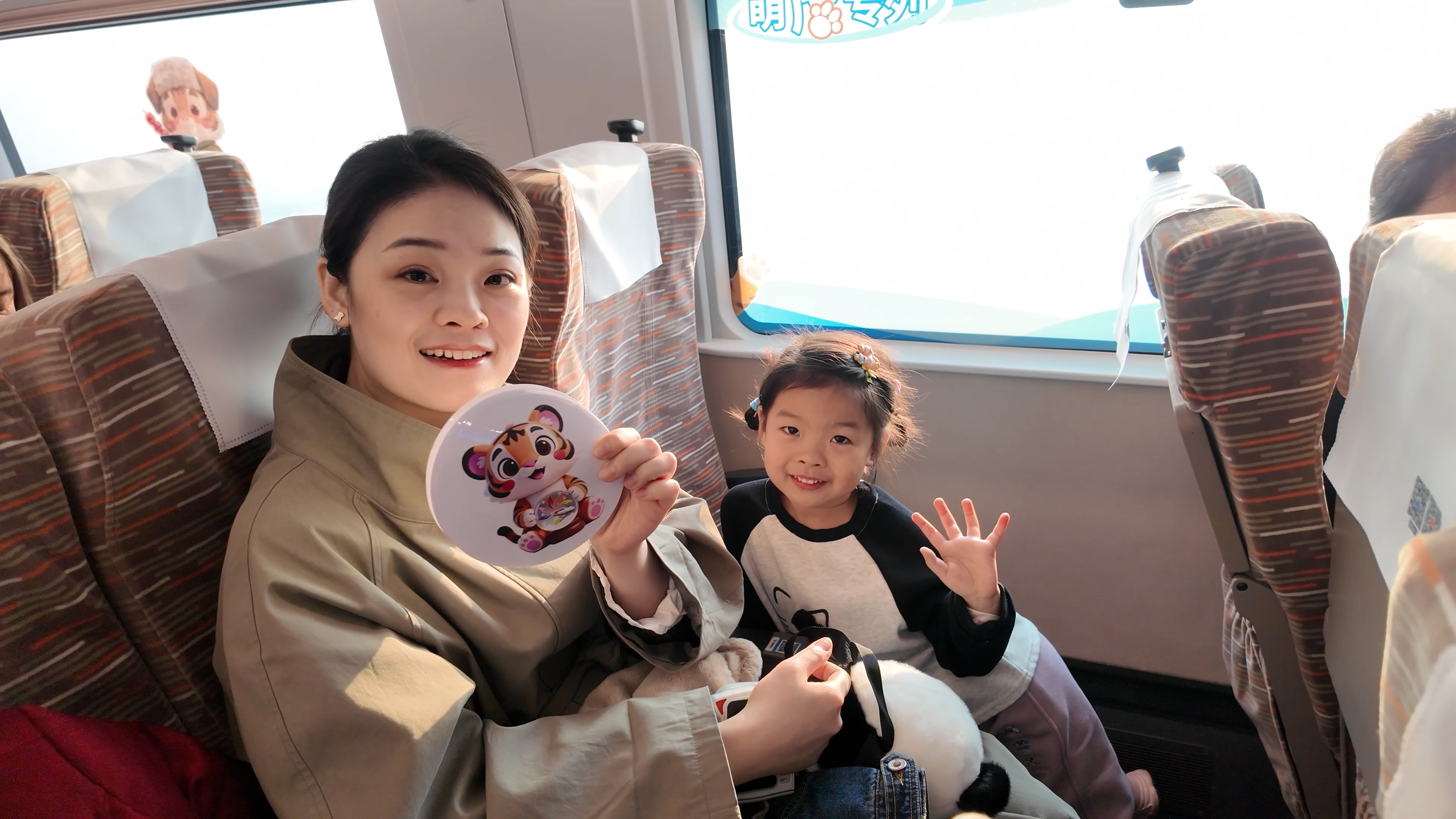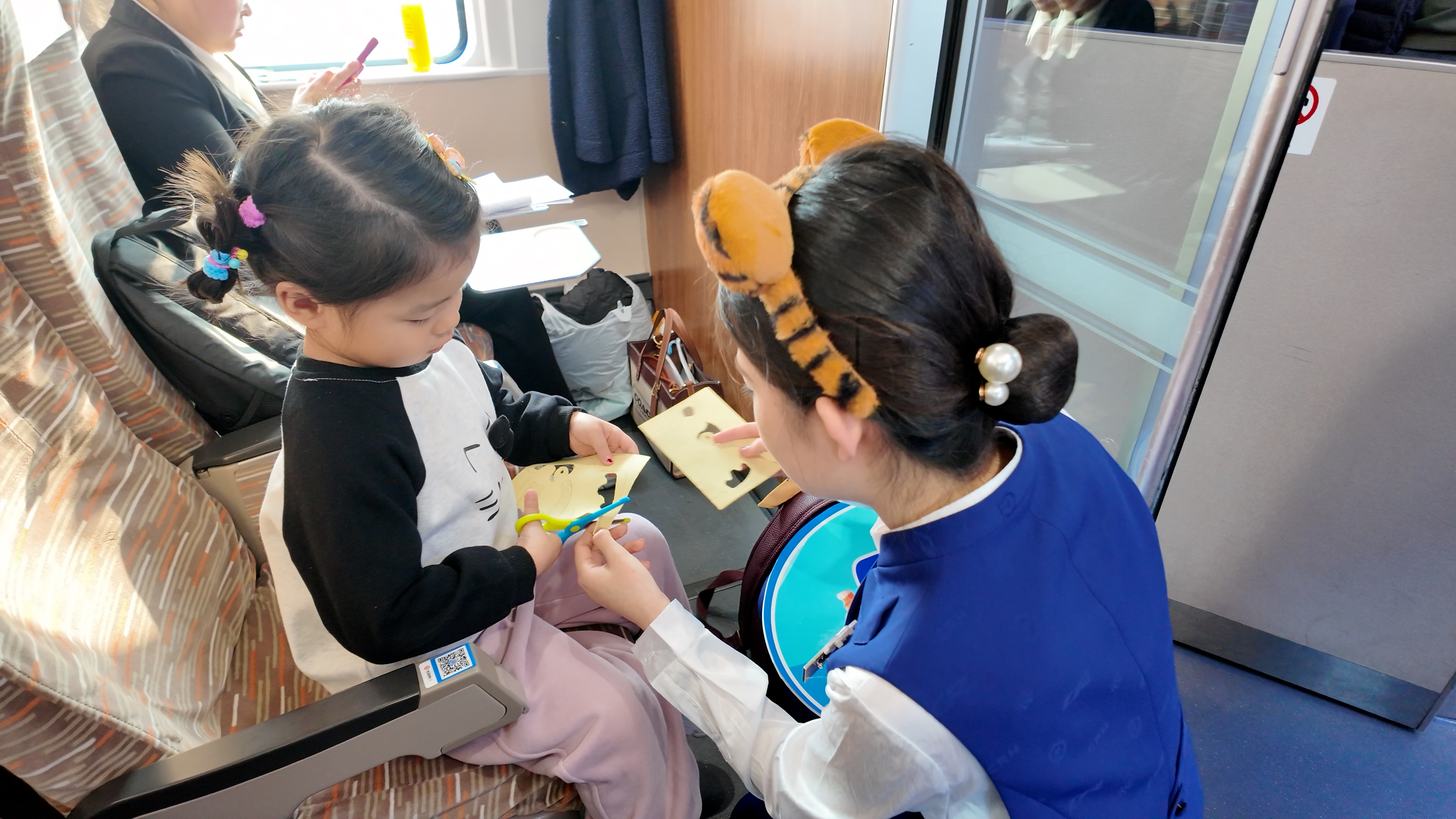 车厢内,特色功能区为旅客提供了丰富的文化互动:“东北虎非遗馆”邀请剪纸艺人现场教学,旅客可亲手制作虎形窗花;造型可爱的虎形手办、虎纹饼等泥塑也备受青睐。乘务人员佩戴虎形徽章,随车讲解科普知识,并组织互动活动,旅途氛围温馨愉悦。