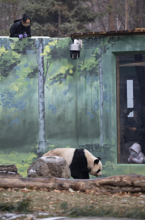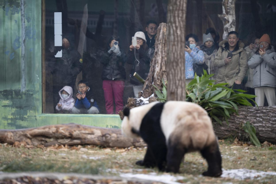 11月8日,哈尔滨市再次迎来降雪,在太阳岛风景区大熊猫馆内的熊猫兄弟“芝士”和“芝麻”成为雪地里的一对“活宝”。两只国宝在银装素裹的户外场地活力十足。弟弟“芝士”尤为好动,在雪地里撒欢奔跑、连续打滚,身上沾满雪花也毫不在意,哥哥“芝麻”时而悠闲踱步巡视领地,时而稳靠树木悠闲吃竹子,憨态可掬。游客们纷纷记录下这对“国宝”兄弟的雪中萌态。