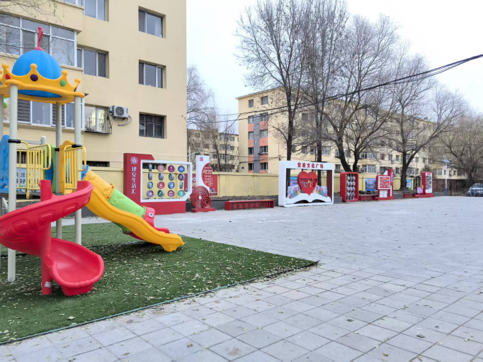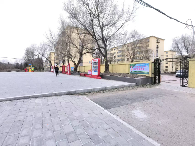 街道多次组织召开协调会,与学校签订安全共管协议,在便民通道设置智能门禁、监控摄像头等安防设施,并划定错峰通行时段,确保学生出行安全。在此基础上,街道整合资源,敲定“便民通道+广场改造”一体化方案,同步推进基础设施升级与环境美化。施工过程中,街道全程统筹协调:协调区城管局完成场地清理、地面硬化、排水系统铺设等基础工程;对接哈尔滨理工大学等高校,组织大学生志愿者开展墙绘创作,将社会主义核心价值观、文明城市创建等元素融入墙面美化;主导广场功能布局与文化设计,植入党建文化雕塑、红色宣传展板,增设儿童游乐区、休闲座椅、健身器材等便民设施,实现“红色教育+便民服务”双融合。