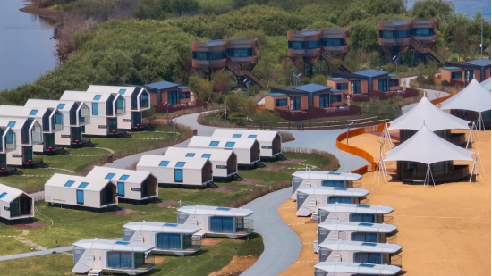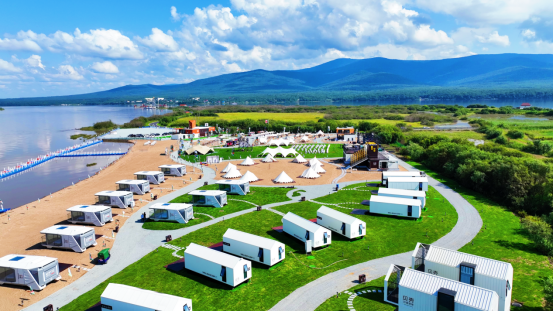 生态保护是营地发展的根本准则。秉持“开发与保护并重”理念,营地采用装配式建筑以减轻环境压力,选用EU生态标签清洁产品,配置智能节能设备,全面落实垃圾分类与污水净化,精心守护乌苏里江沿岸生态本底。以“露营+”模式串联多元业态,覆盖高端住宿、江鲜美食、天幕烧烤等特色内容,以及垂钓、亲子互动、户外婚礼、企业团建等休闲项目,实现“食住行游购娱”全链条覆盖,构建文旅消费闭环,成为区域经济发展的“新引擎”。营地还提供百余个就业岗位,助力当地居民增收,持续提升“东极度假”品牌影响力。