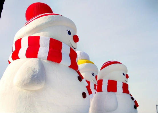 这组雪雕由“雪爸爸”、“雪妈妈”和可爱的“雪宝宝”组成。它们都有着圆圆的身体和圆圆的眼睛,憨态可掬,十分可爱。