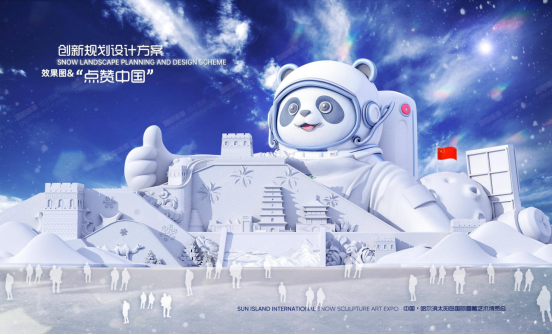 《点赞中国》主雪雕长103米、高33米,用雪量达3万立方米,堪称历届主雪雕中的“天花板级别”作品。它以中国独有的元素为灵感,将国宝大熊猫、大雁塔、长城、航天等元素巧妙融合,展现了中国文化的深厚底蕴与航天成就的辉煌。“以‘点赞’姿态传递对祖国发展的自豪与赞颂,是冰雪艺术与家国情怀的精彩交融。相信一定会为游客带来震撼心灵的视觉体验和身为中国人的自豪感。”太阳岛雪博会相关负责人说。