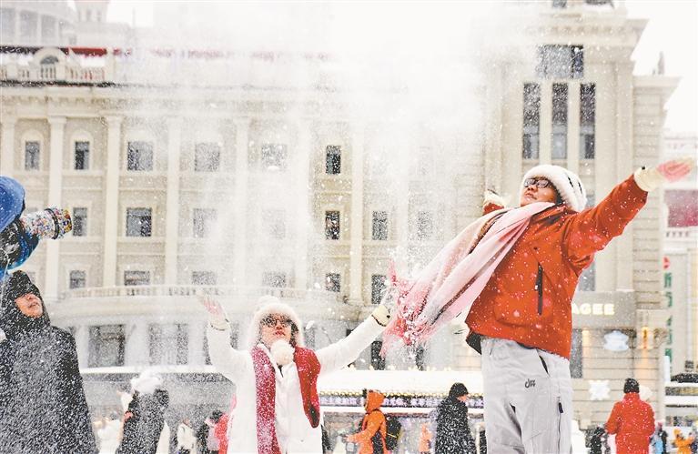 上午,冰城的街道上、树上、房上、车上都积了一层厚厚的白雪,整个城市变成了一个美丽的“童话世界”。在各处景点,游客们兴奋地在雪中拍照片、打雪仗,尽享北国冰雪带来的快乐。