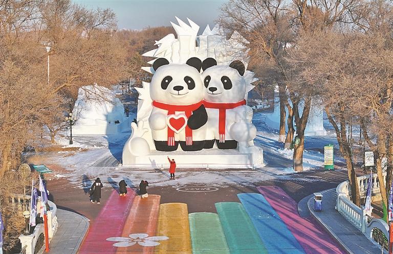 本届太阳岛雪博会雪雕《太阳岛来客》(本报记者 张澍摄)